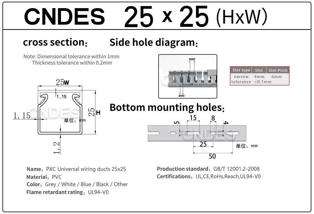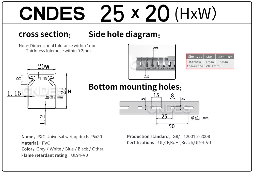 Prostřednictvím našeho nezávisle vyvinutého vysoce přesného lisovacího zařízení v kombinaci s jedinečným segmentovaným automatickým řezacím procesem může CNDES flexibilně vyrábět produkty v různých specifikacích, včetně vysoce výkonných 25 mm vysokých PVC štěrbinových ovládacích kanálů, splňujících různorodé potřeby zákazníků v rozvaděčích a elektrických systémech.