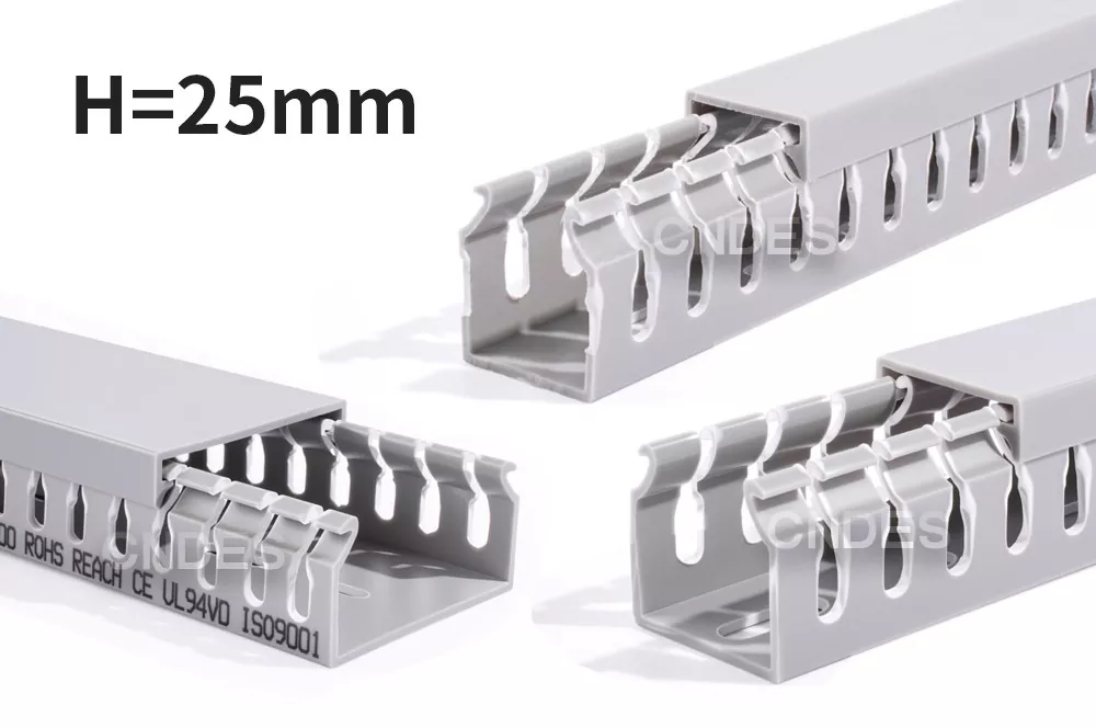Tento produkt je štěrbinový kabelový kanál z PVC s nízkou výškou navržený k uspořádání, ochraně a vedení elektrických kabelů uvnitř ovládacích panelů. Výška 25 mm umožňuje instalaci: