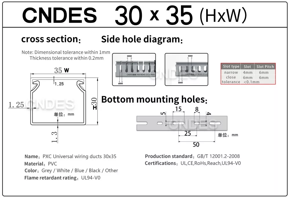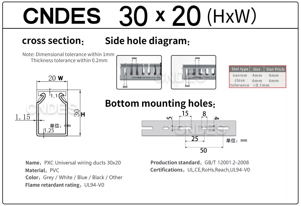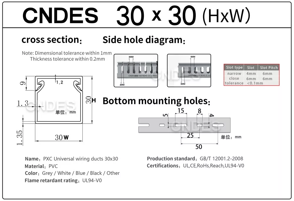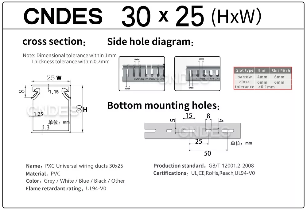 Zahrnuje informace, jako je tloušťka, rozměry a vrtání našeho kvalitního 30 mm štěrbinového PVC kabelového vedení.