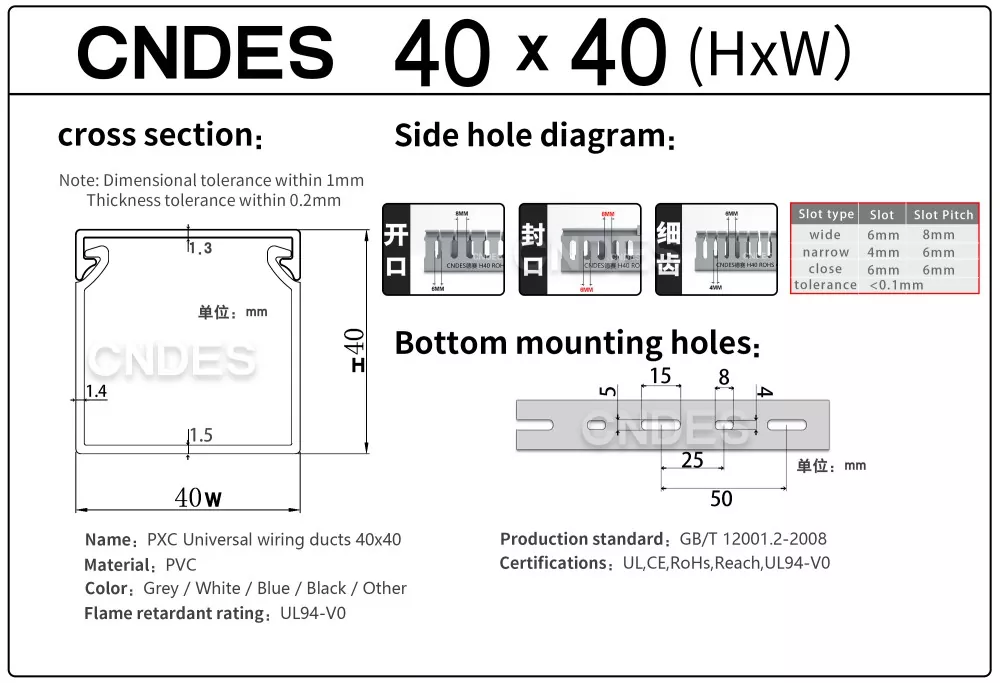 Můžete si být jisti, že si koupíte kvalitní 40×40 PVC kabelový kanál s krytem z naší továrny (CNDES). Výška 40 mm a šířka 40 mm.