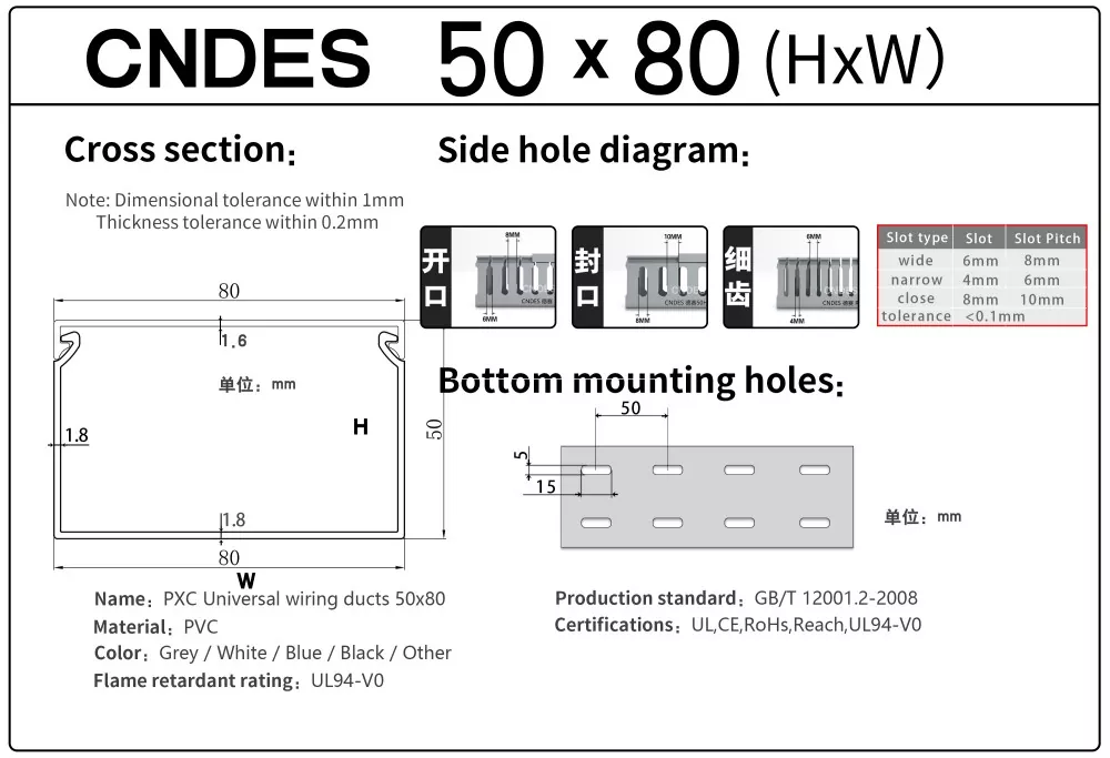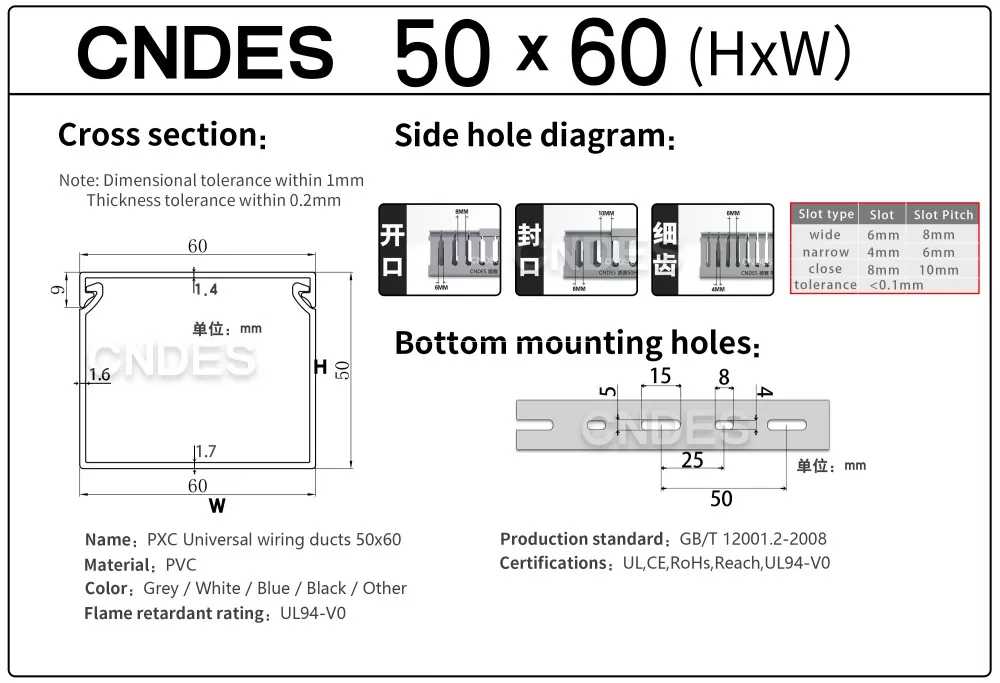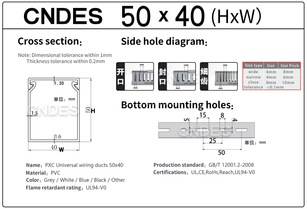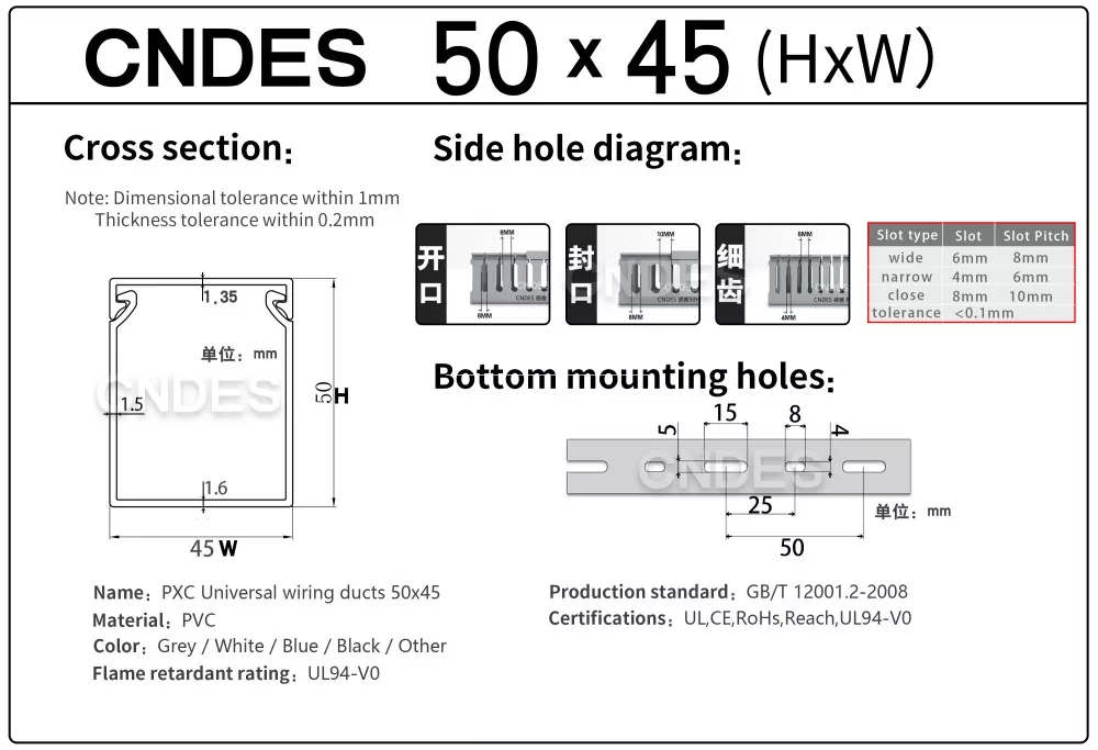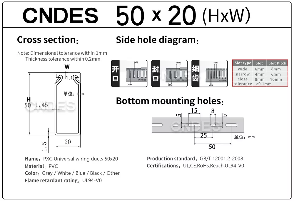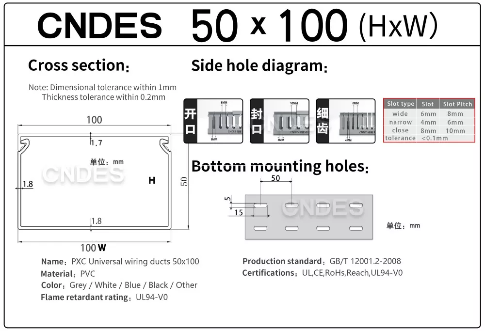 CNDES je výrobcem a dodavatelem specializujícím se na dodávky štěrbinových kabelů PVC panelů. Zde představíme naše 50 mm vysoké kabelové kanály, včetně následujících specifikací: 50*20,50*25,50*30,50*35,50*40,50*45,50*50,50*55,50*60,50*80,50*100.