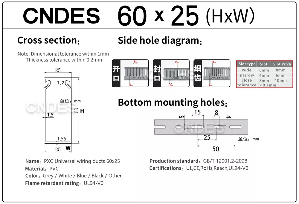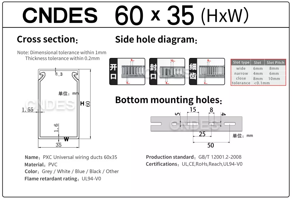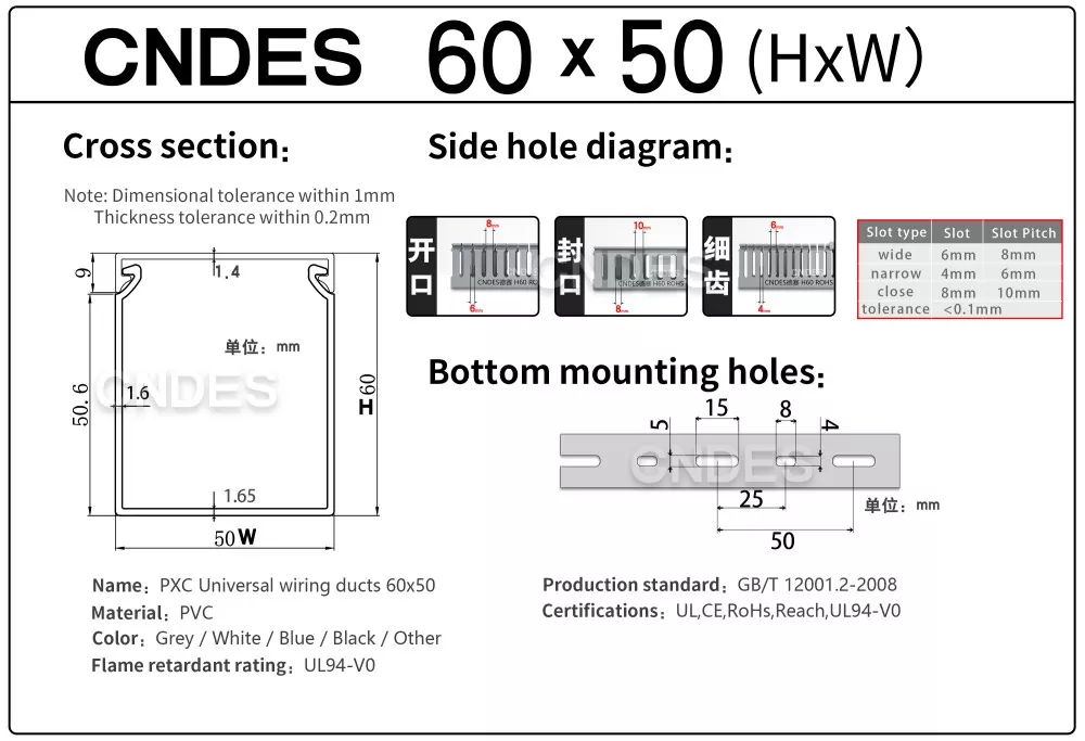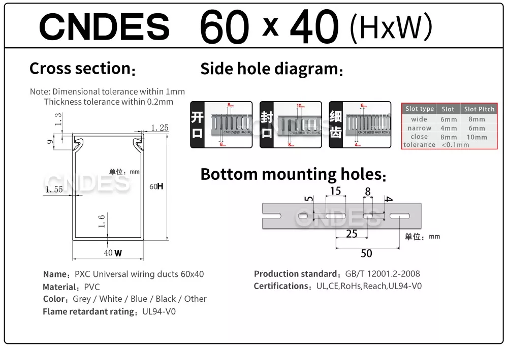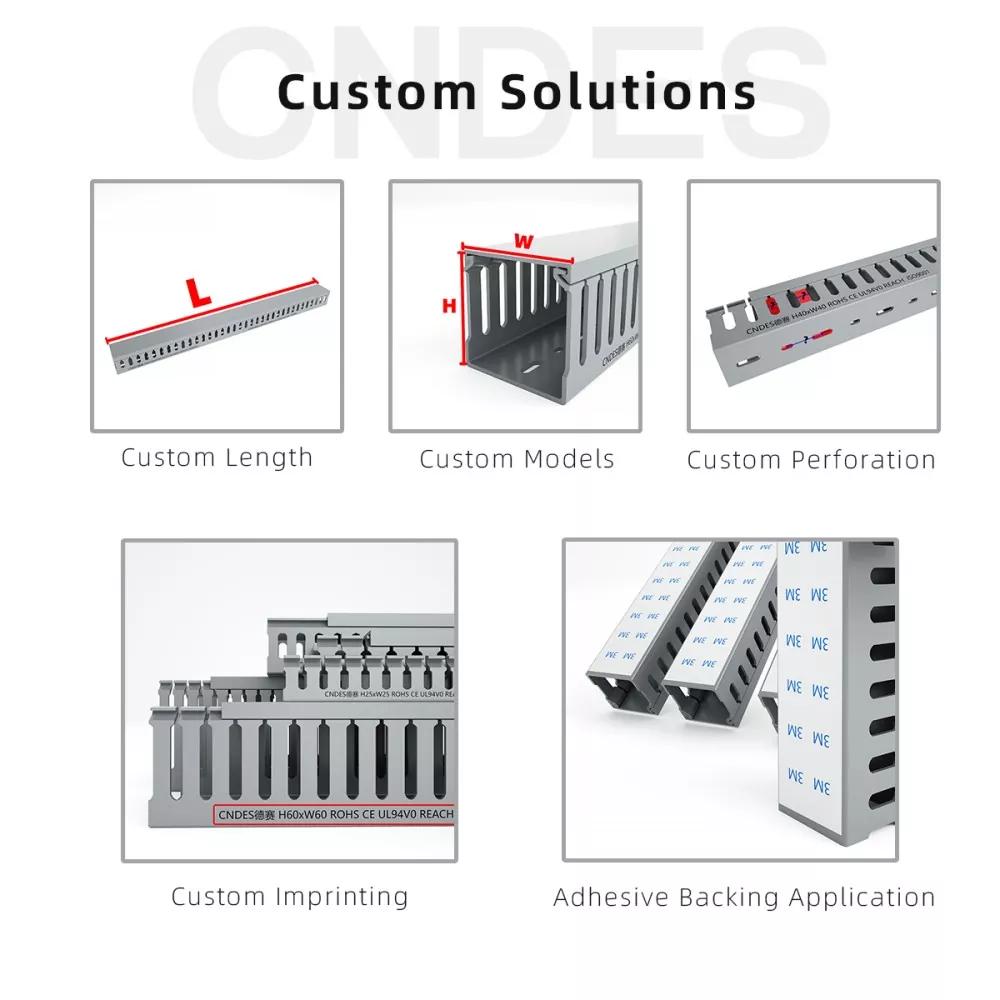 Tento přizpůsobený 60mm šedý štěrbinový kabelový kanál z PVC vyrábí společnost CNDES, přední dodavatel kabelových žlabů z PVC v Číně. Konstrukce s otevřenou drážkou usnadňuje vkládání, vyjímání a následné úpravy kabelu. Ať už zapojujete PLC systémy, elektrické ovládací panely nebo mechanická zařízení, tento 60 mm vysoký šedý štěrbinový kabelový žlab z PVC zajistí, že vaše kabely budou chráněny a udržovány čisté a organizované.