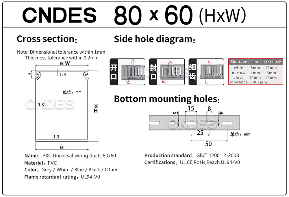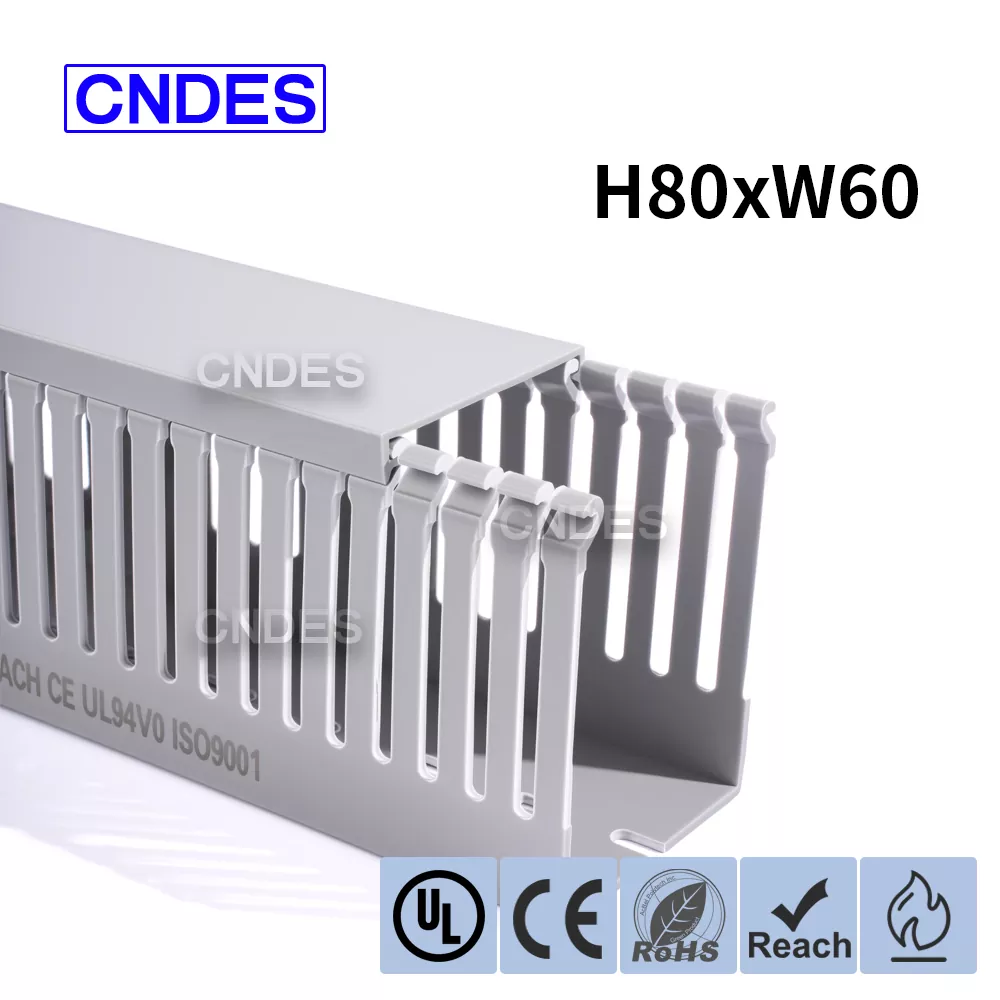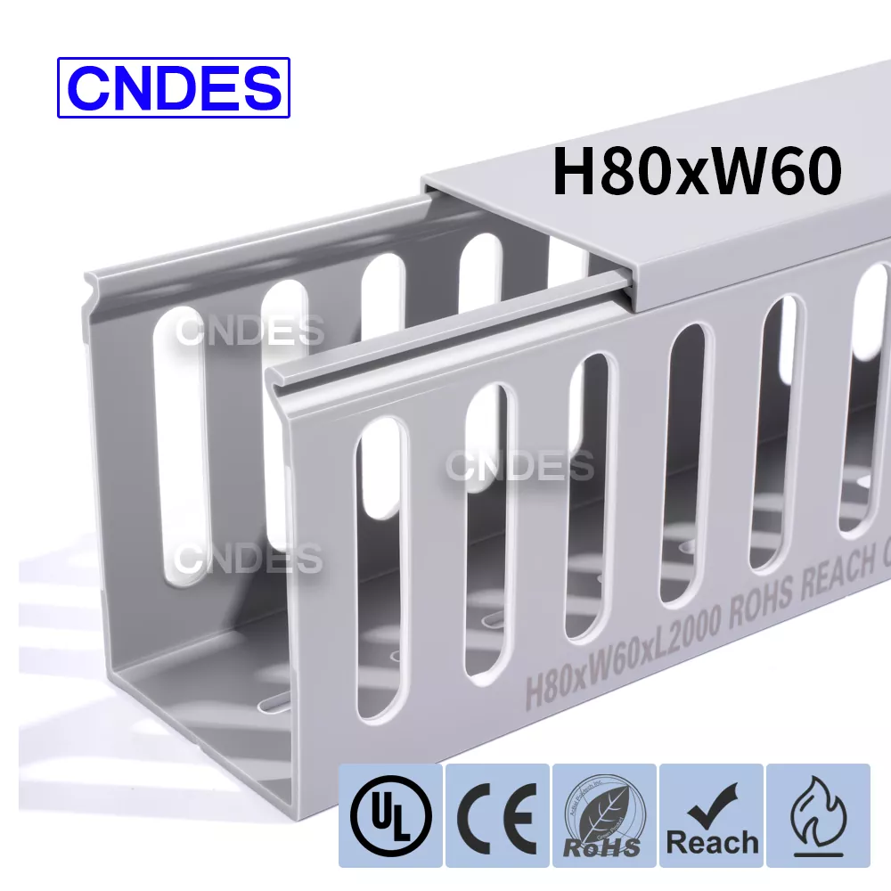 CNDES je přední výrobci a dodavatelé štěrbinových PVC kabelových kanálů uvedených na seznamu UL s konkurenčními továrními cenami! Tato přizpůsobená 80×60 uvedená štěrbinová PVC kabeláž má rovnoměrně rozmístěné otevřené štěrbiny na obou stranách pro rychlé vedení kabelů, navlékání a budoucí údržbu. Rozšířené okraje štěrbin zvyšují strukturální tuhost a zároveň rozšiřují kapacitu kabelu. Zaoblené hrany zabraňují poškození izolace rukou nebo vodičů během instalace. Drážkovaný PVC kabelový kanál uvedený na seznamu UL obsahuje protiskluzové kryty, které zajišťují bezpečné uzavření a zabraňují náhodnému otevření.