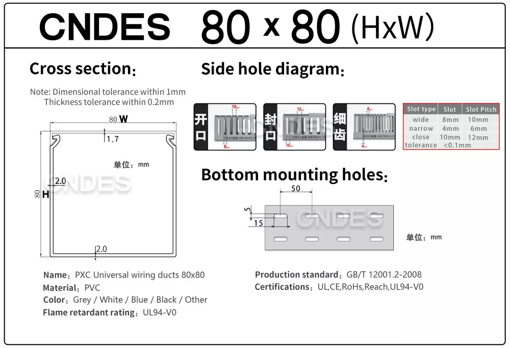 Když standardní kabelové žlaby nevyhovují složitým kabelovým svazkům, je vaší dobrou volbou kabelový kanál CNDES Customized 80×80 PVC rozvaděč. Díky velkému vnitřnímu prostoru 80 mm x 80 mm je speciálně navržen pro scénáře s vysokou poptávkou, jako je páteřní kabeláž datových center, výkonové clustery průmyslových zařízení a centralizovaná kabeláž ve velkých ovládacích skříních. Snadno pojme a uspořádá velké množství kabelů, čímž jednou provždy dá sbohem nepořádku a přetížení.
