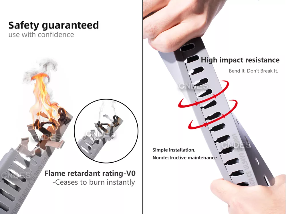 2. Pevnost v průmyslové třídě, bezpečná a spolehlivá: Kvalitní 80×80 štěrbinová kabeláž PVC rozváděče je vyrobena ze zesíleného nehořlavého PVC materiálu (UL94-V0), díky čemuž je robustní, trvanlivá, odolná proti nárazu a má vynikající nosnost. Poskytuje trvalou ochranu kabelů i v prostředí s vibracemi.